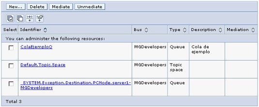 - Colas (JMS). Una cola JMS es un objeto administrativo que encapsula el nombre de un destino de tipo cola definido en un bus de integración de servicios, las aplicaciones deben obtener estos objetos administrativos realizando una búsqueda en el espacio de nombres JNDI.