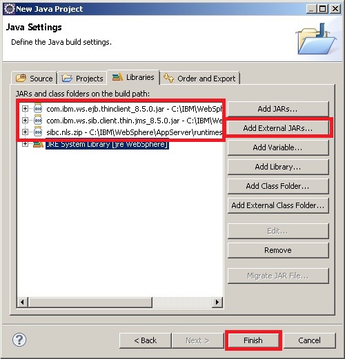 - com.ibm.ws.sib.client.thin.jms_8.5.0.jar, esta librería corresponde al IBM Thin Client for JMS que permite a una aplicación acceder al proveedor de mensajería por omisión del servidor IBM WebSphere Application Server.